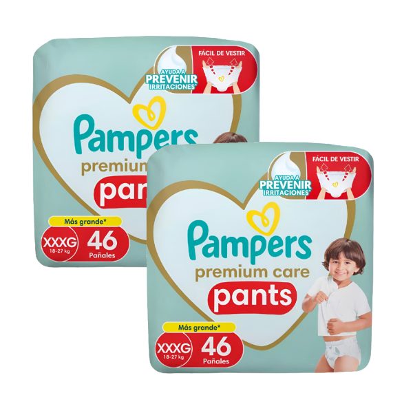 Talle XXXG de 18 a 27 kg Esta nueva opción combina la reconocida calidad del pañal más suave y seco de Pampers, con la ligereza y el confort del formato Pants, que facilita la tarea de cambiar a los bebés, incluso cuando están en movimiento. Los Pampers Premium Care Pants garantizan hasta 12 horas de protección, gracias a su ajuste anatómico con cobertura 360 y la mejor cinta de cintura del mercado, que brindan una mayor libertad de movimientos y un nuevo nivel de confort al bebé. Además, su textura suave como algodón permite que su piel respire mejor, previniendo las típicas paspaduras provocadas por la humedad.